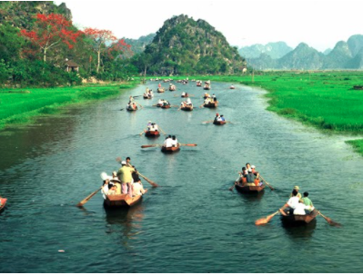 The pilgrims and traveler can travel by boat along Yen river to the base of Huong Son Moutain, passing by limestone caves and rice field. The journey continues on foot by climbing hundreds of stone steps towards Huong Tich cave, the main place for the festival.